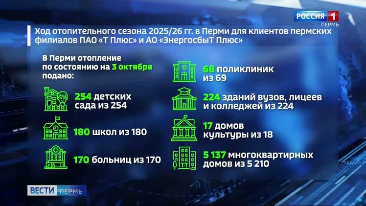 Пермские тепловые сети пермского филиала ПАО «Т Плюс» завершили запуск тепла для потребителей в Перми. Подключение тепла велось параллельно в социальных объектах, детсадах и школах, в медицинских и образовательных, культурных учреждениях и жилфонде. Отопительный сезон в краевой столице стартовал 22 сентября по решению главы города Эдуарда Соснина.