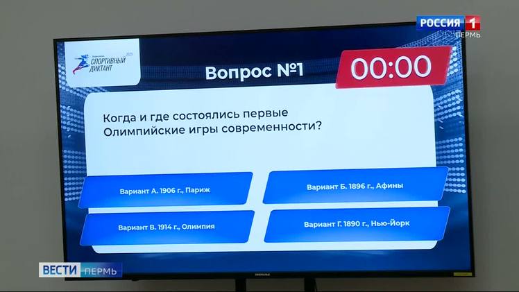Профильный вопрос задаёт председатель олимпийского комитета России, министр спорта Михаил Дегтярёв. Вариантов ответа четыре. Но верный под «Б»: 1896 год, Афины.