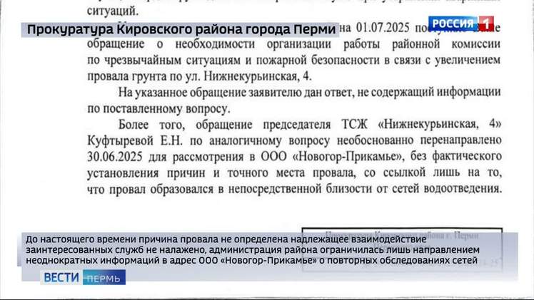 Прокуратура Кировского района города Перми: «До настоящего времени причина провала не определена, надлежащее взаимодействие заинтересованных служб не налажено. Администрация района ограничилась лишь направлением неоднократных информаций в адрес ООО «Новогор-Прикамье» о повторных обследованиях сетей водоотведения, а также водопровода. С учетом изложенного, учитывая выявленные нарушения прокуратурой района в адрес главы администрации района внесено представление».
